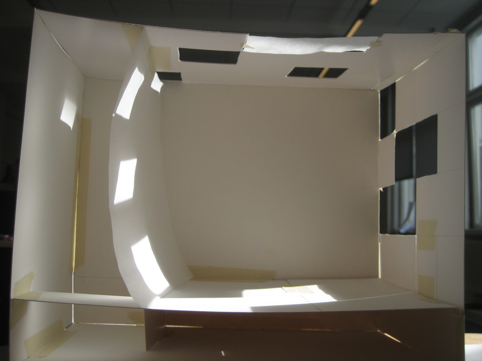 I designed a glass panel system on the outside wall and ceiling where each pane could transition from a gradient of completely clear, allowing all the light in, to completely dark, blocking it all out. The student could create combinations that formed different lighting patterns throughou the day depending on what they were in the mood for. I modeled a few of the many variations the room could get based on the season and time of day.
